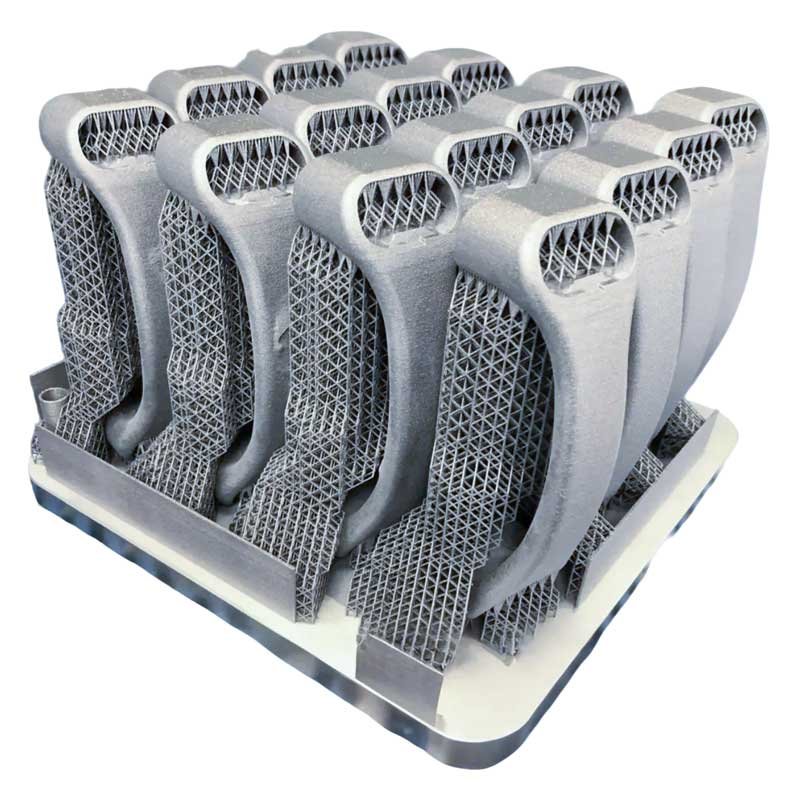 The DMLS machine begins sintering each layer—first the support structures to the base plate, then the part itself—with a laser aimed onto a bed of metallic powder. After a cross-section layer of powder is micro-welded, the build platform shifts down and a recoater blade moves across the platform to deposit the next layer of powder into an inert build chamber. The process is repeated layer by layer until the build is complete.